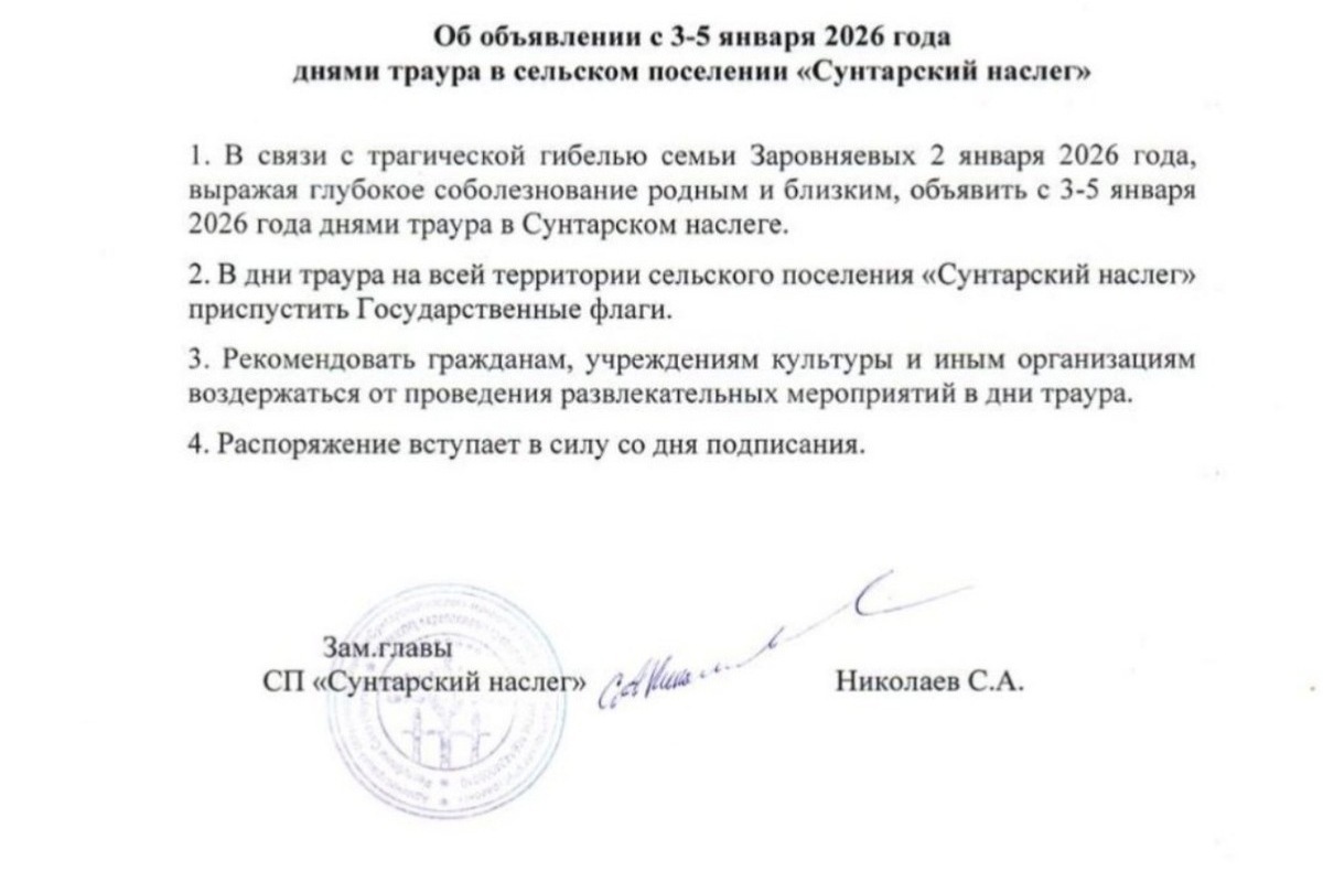 В Сунтарском наслеге с 3 по 5 января объявлен траур в связи с гибелью семьи Заровняевых при пожаре. Напомним, что трагедия произошла в селе Сунтар, где в результате возгорания в частном домовладении погибли пять человек, включая троих детей 2018, 2020 и 2023 годов рождения, а также их родителей.