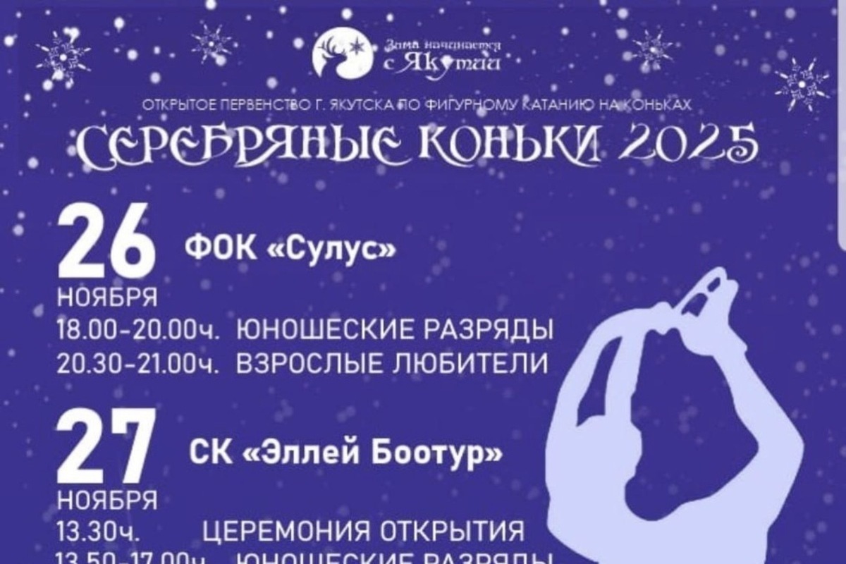 В рамках ежегодного фестиваля «Зима начинается с Якутии» столица республики примет открытое первенство Якутии по фигурному катанию. Соревнования под названием «Серебряные коньки» соберут сильнейших спортсменов региона.